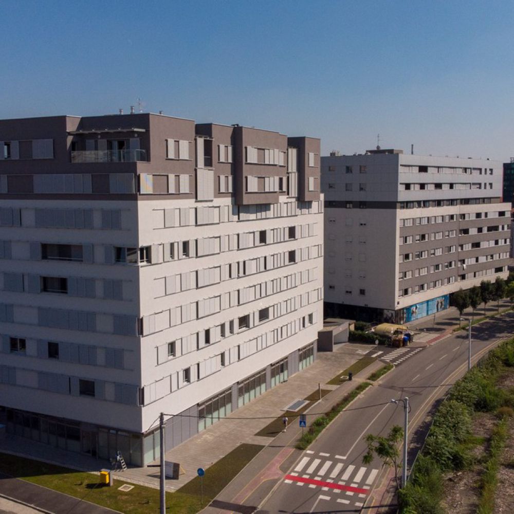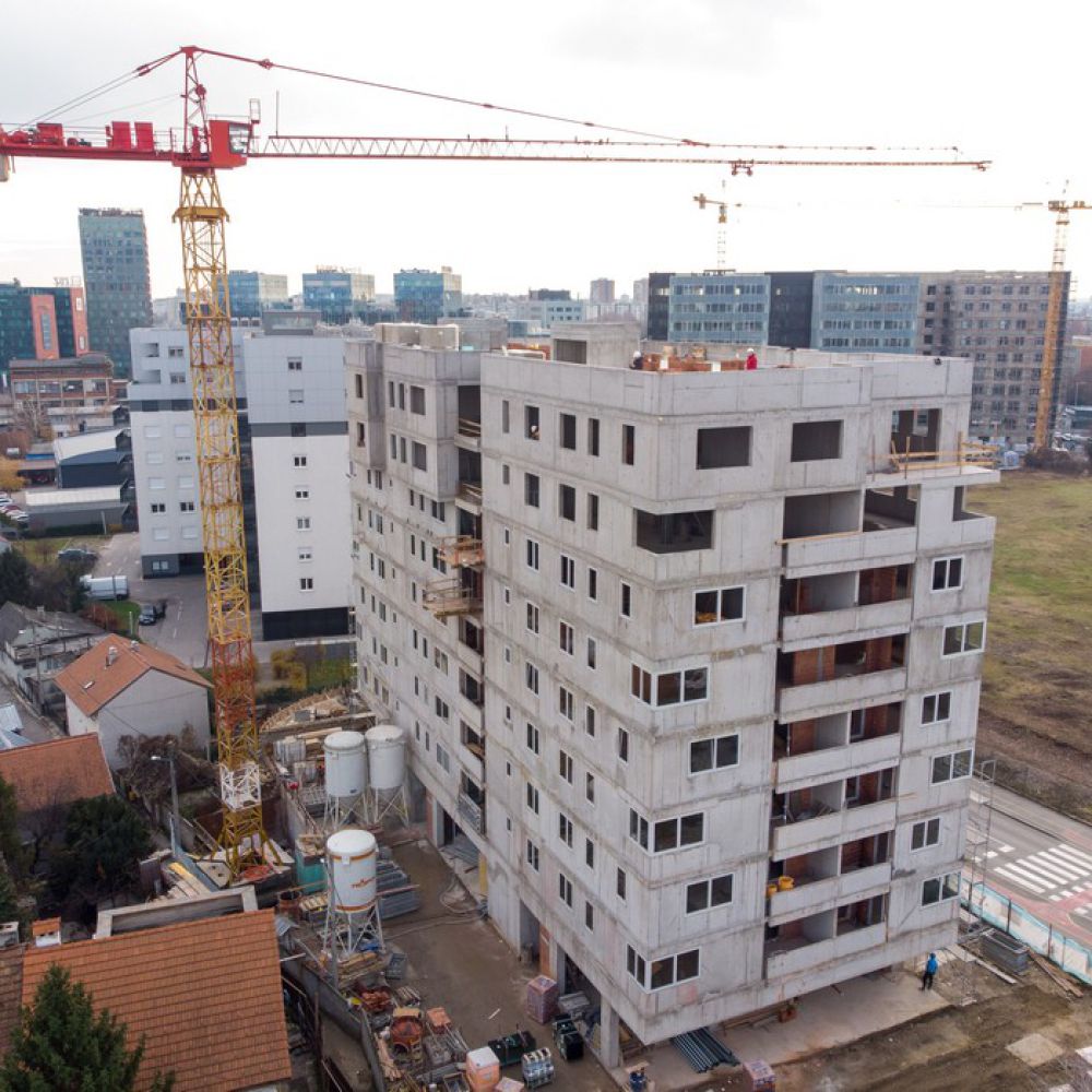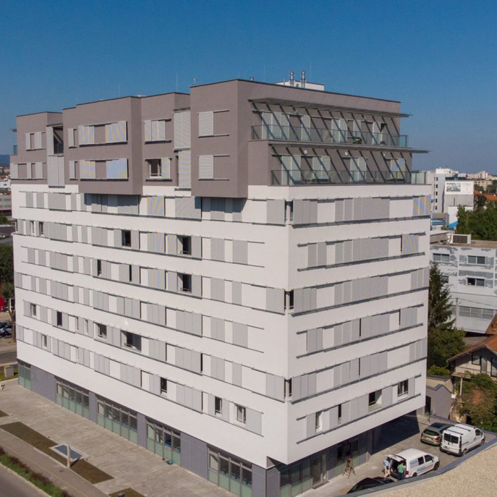 The building has an attractive appearance with protruding parts on the seventh and eighth floors, while the sliding shutters and the colour change of the last two floors give the facade life. The apartments are designed so that most of them have a two-sided orientation and a comfortable loggia, i.e., a terrace for the best possible quality of life.