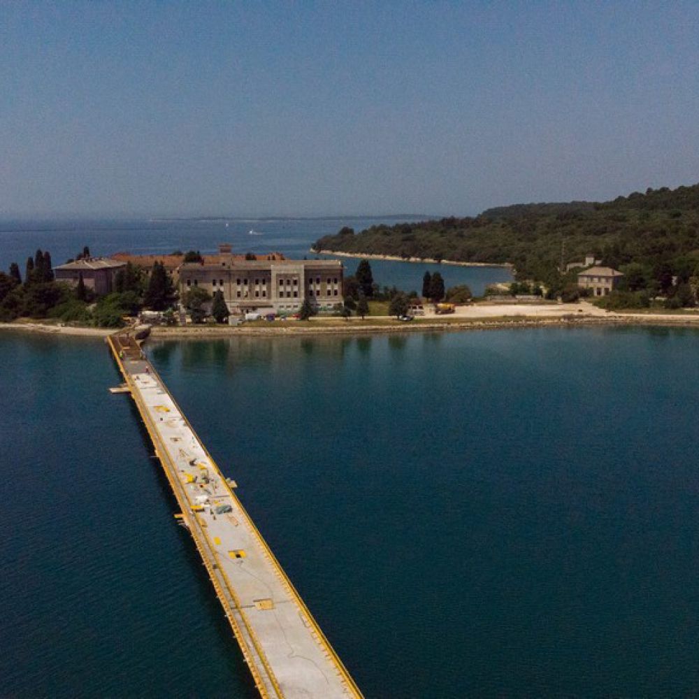The bridge that connects the Monumenti peninsula and the island of St. Catherine is 233.95 m long, and consists of twenty-one spans ranging in length from 6.95 m to 8.10 m, with a total width of 4.5 m. The reconstruction of the bridge itself consisted of making new piles with a diameter of 50 cm and hidden new horizontal reinforced concrete structures within the dimensions of the existing bridge with complete reinforcement of the original reinforced concrete structure. A new 6-m-wide pavement slab was constructed, consisting of a 5-m-wide pavement and protective curbs on both sides of the bridge. During the execution of the works, access to the execution was difficult for the simple reason that the building is located directly above the sea, and most of the rehabilitation work had to be carried out from a pontoon