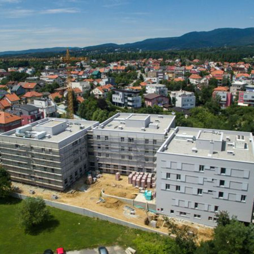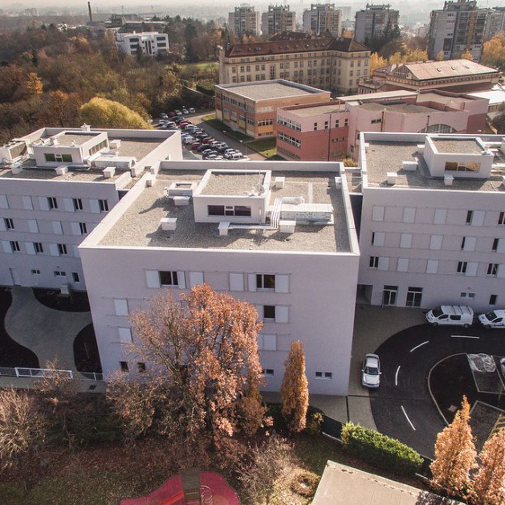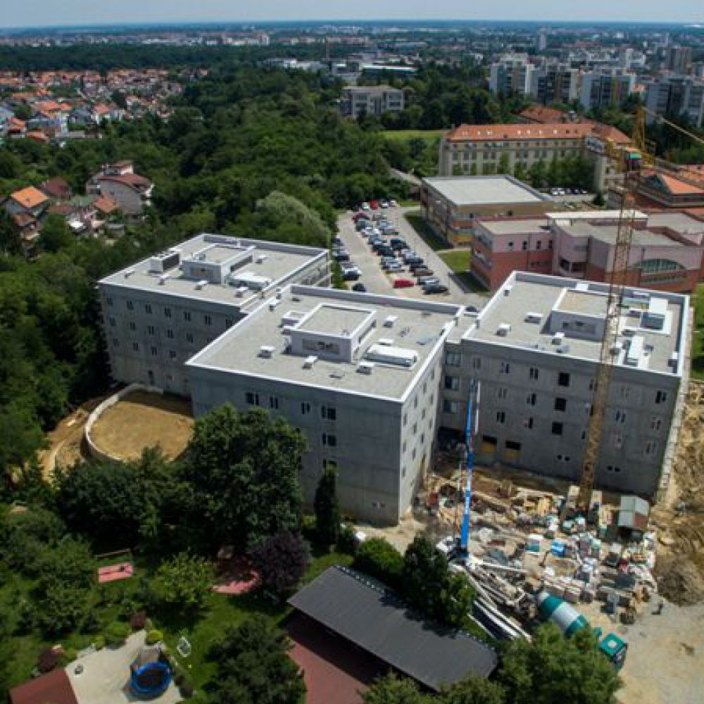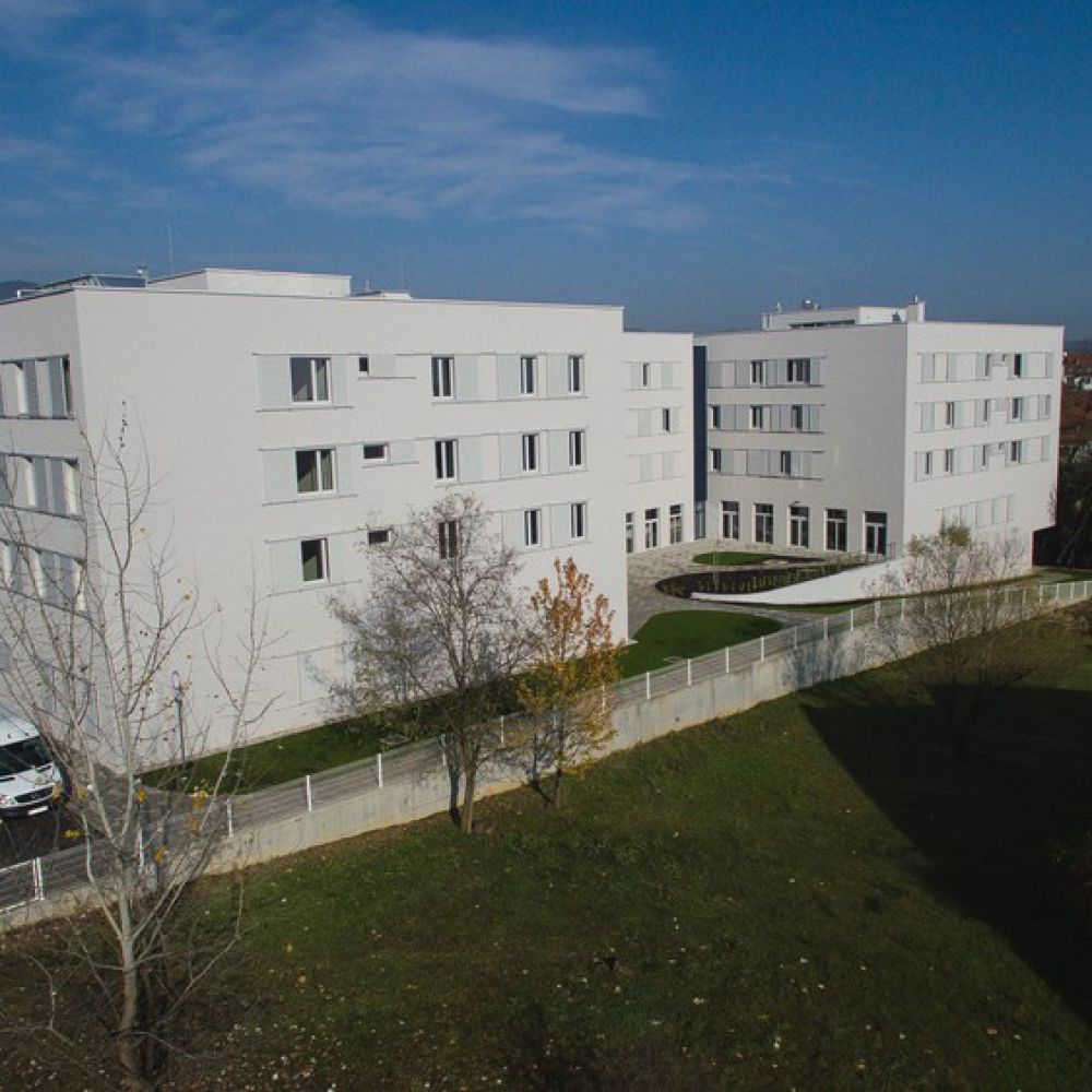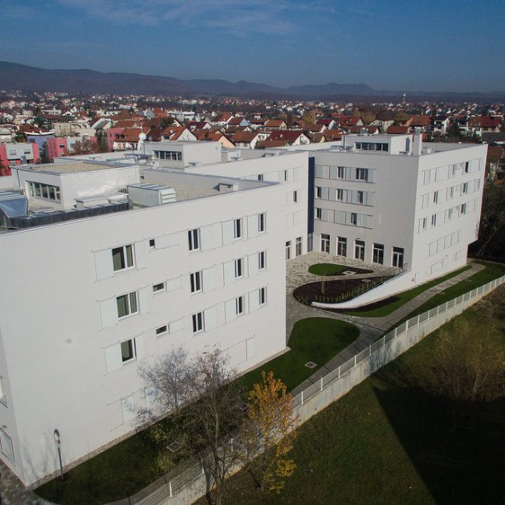 In the green oasis along Lašćinska cesta in the Maksimir neighbourhood of Zagreb, a fully equipped facility with a capacity of 200 users has been built for the accommodation of the elderly and infirm. The simple architecture of the buildings consists of three staggered squares, i.e., interconnected pavilions, which enables all social spaces to have direct contact with the environment.
