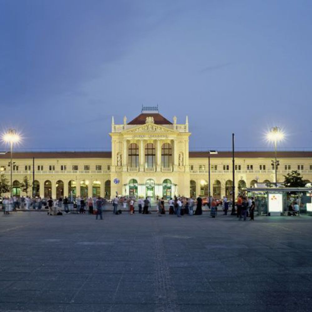 Autor projekta za zgradu zagrebačkoga Glavnog kolodvora mađarski je arhitekt Ferenc Pfaff, glavni inženjer Državnih ugarskih željeznica, koji projektira sve najvažnije projekte iz njihove nadležnosti. Na području Hrvatske projektira željezničke kolodvore u Rijeci, Osijeku, Karlovcu i Zagrebu. Zgrada zagrebačkoga Glavnog kolodvora građena je od 1890 do. 1892. i smještena je aksijalno u odnosu na os kemijskog laboratorija te gradski perivoj u produljenju akademskog trga. Dugačka je 186,5 m, horizontalno je razvedena, relativno niskoga paviljonskog tipa pročelja rastvorenog kolonadama prema Zelenoj potkovi. Pročelje je podijeljeno u tri dijela, od kojih je središnji najviši, a dva su bočna krila niža, s ugaonim rizalitima. Bogato je dekorirano inventarom neoklasicističke ornamentike te skulpturalnim ukrasima koji se sastoje od alegorijskih kompozicija – alegorija prometa smještena je u centralnom zabatu, alegorija stočarstva i lova u nišama su na visini prvog kata, a na atici rizalita nalaze se alegorije poljodjelstva i industrije. Skulpturu je izvelo kiparsko poduzeće Vilima Maršenka iz Budimpešte 1891./1892., a radove na zgradi segedinska tvrtka Iv. Milko.